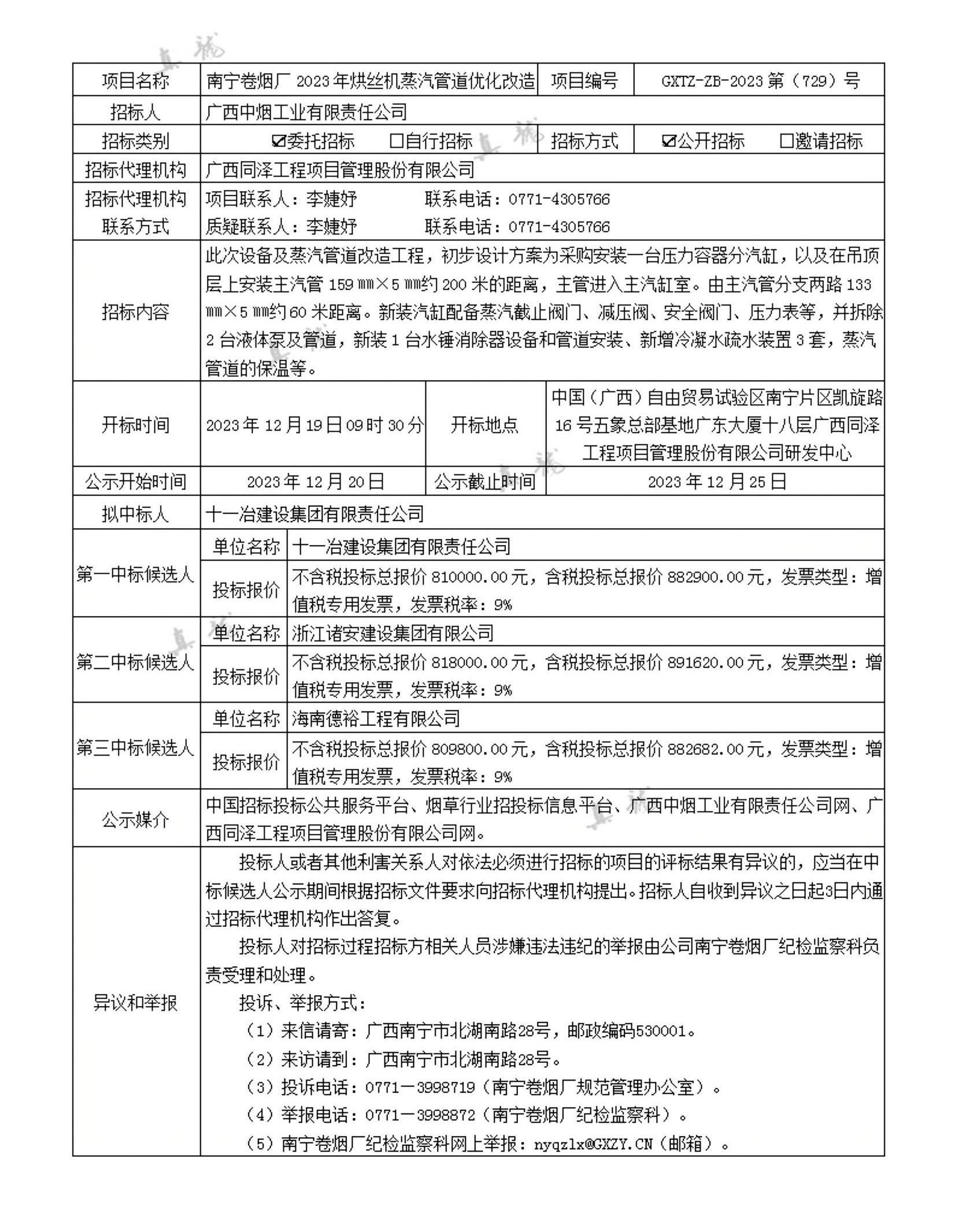 廣西中煙工業(yè)有限責任公司南寧卷煙廠2023年烘絲機蒸汽管道優(yōu)化改造(項目編號:GXTZ-ZB-2023第(729)號)中標候選人公示