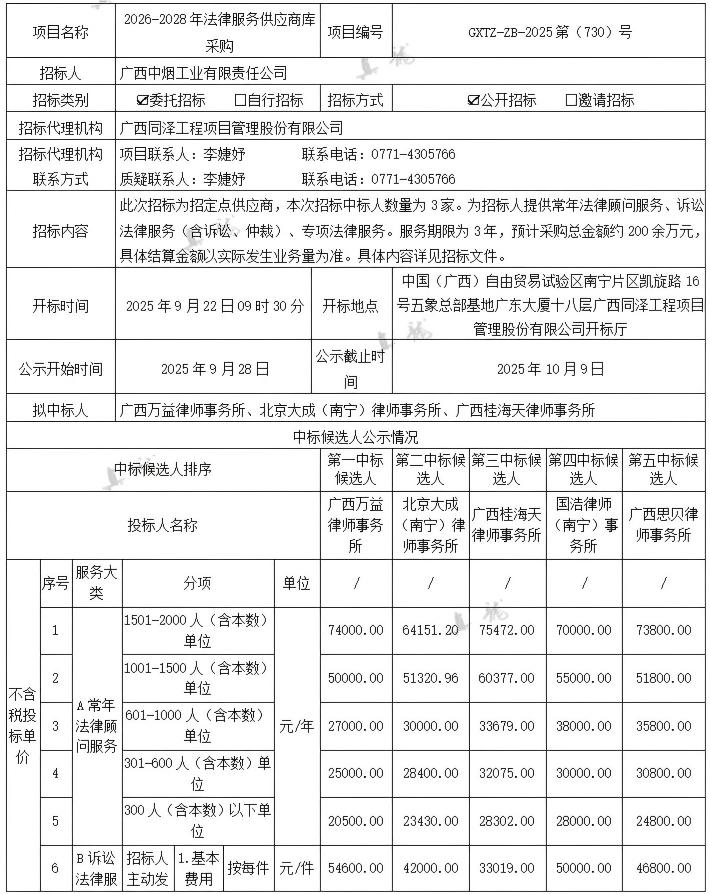 廣西中煙工業(yè)有限責(zé)任公司2026-2028年法律服務(wù)供應(yīng)商庫(kù)采購(gòu)(項(xiàng)目編號(hào):GXTZ-ZB-2025第(730)號(hào))中標(biāo)候選人公示