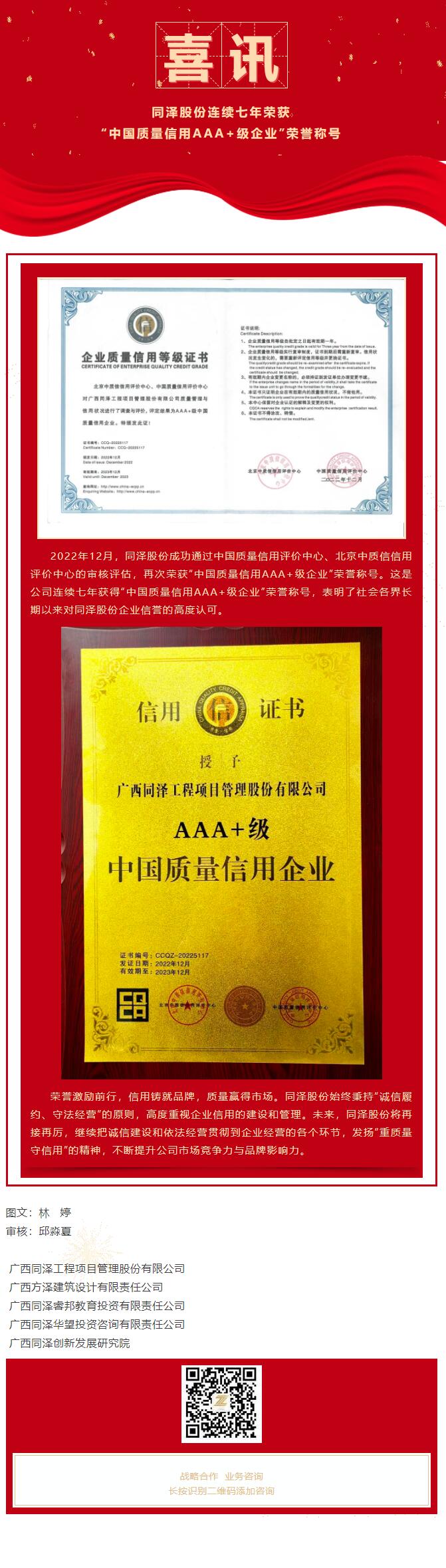 喜訊 | 同澤股份連續(xù)七年榮獲“中國質(zhì)量信用AAA+級(jí)企業(yè)”榮譽(yù)稱號(hào)